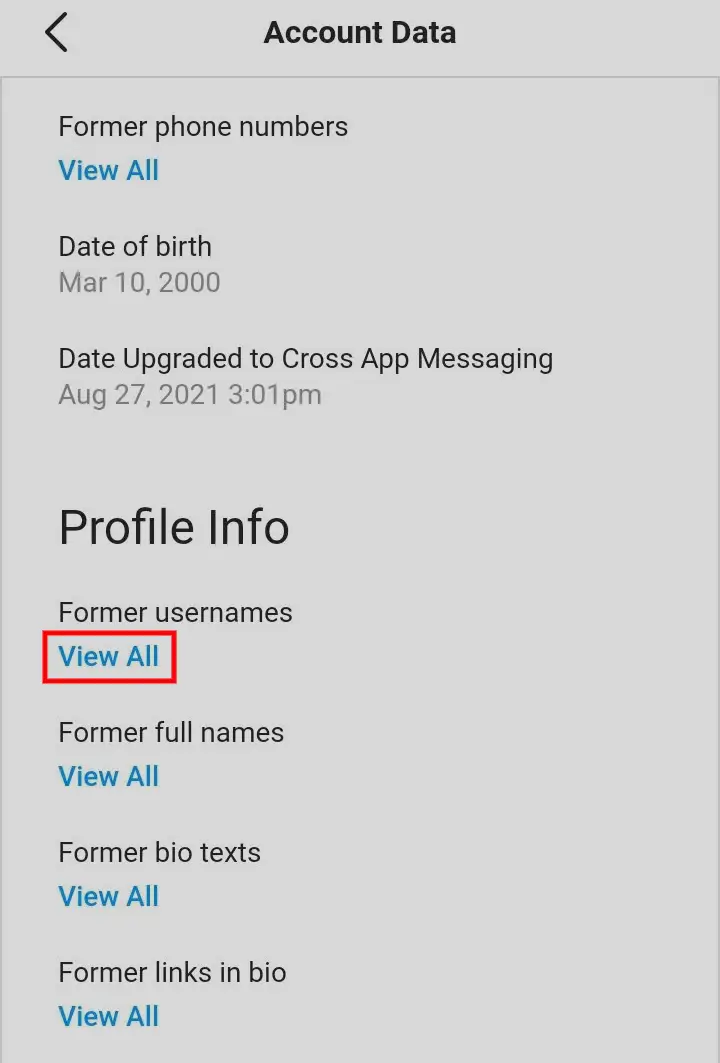Step 6: Navigate to Profile Info and tap View All under Former usernames.